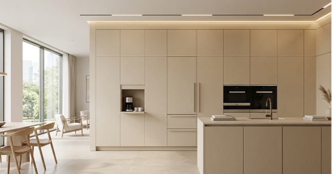 The Look: Handleless doors with "push-to-open" technology or recessed finger pulls.