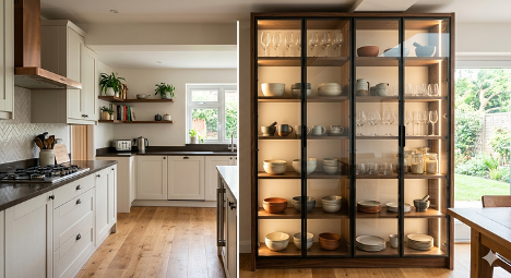 The Vibe: Add internal LED vertical strip lighting. It transforms a storage unit into a glowing display for glassware and ceramics, adding depth and "mood lighting" to the kitchen at night.
